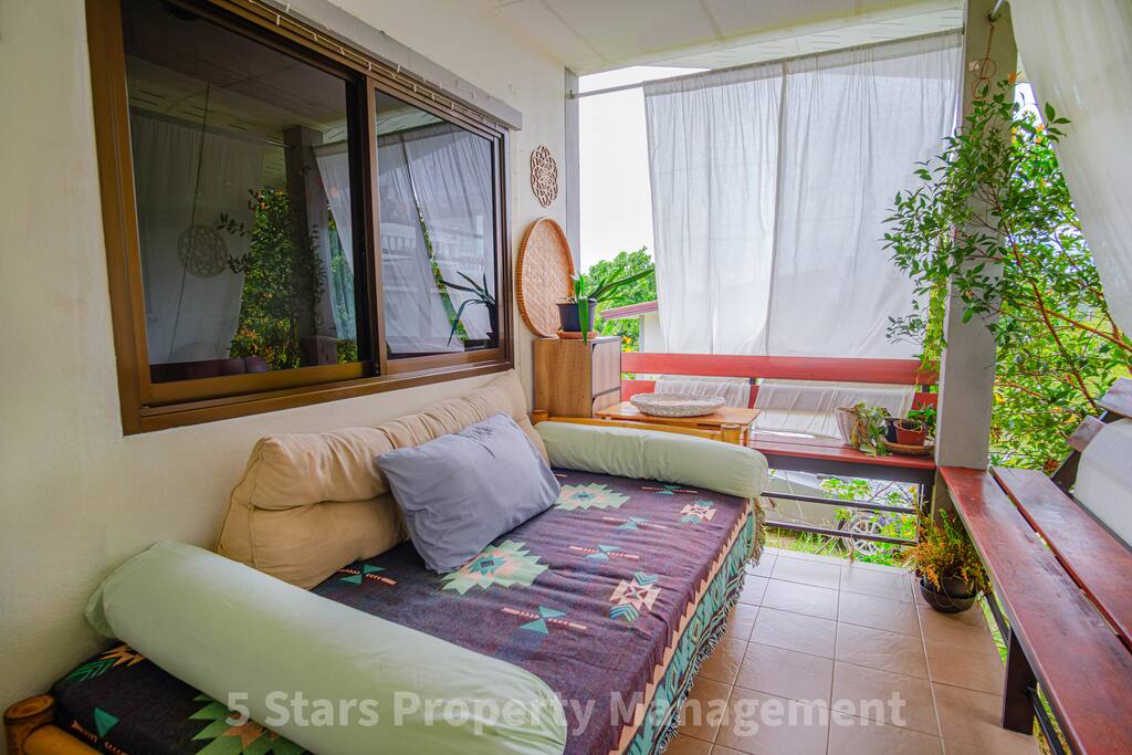 Cozy one-bed hideaway surrounded by palms and flowers. Kick back on the L-shaped sofa, stream a movie, then move onto the covered veranda for sunset and fairy-light vibes. King size bed, modern bathroom, simple kitchenette, strong Wi-Fi, AC, and private lawn with loungers. Shops, cafés, and the pier are just a quick ride away—yet nights stay quiet, with only jungle sounds in the background.