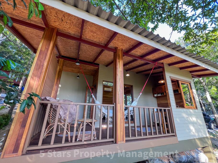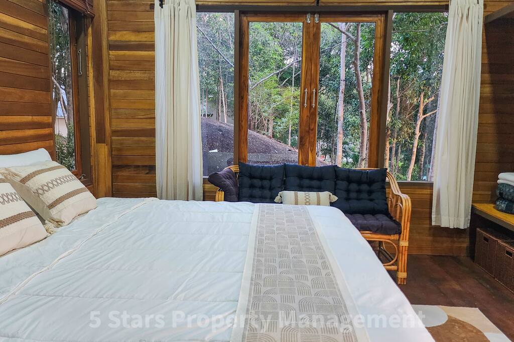 Escape to this handcrafted wooden cabin nestled in the jungle canopy with panoramic mountain views. Perfect for couples or remote workers craving nature immersion without sacrificing comfort. Swing in your private hammock watching sunrise over the hills, or work from the dedicated desk surrounded by treetops. Warm teak interiors, full kitchen, modern bathroom with artisan stone sink. Peaceful location away from the crowds yet 10 mins to beaches. Self check-in, A/C, fast WiFi.