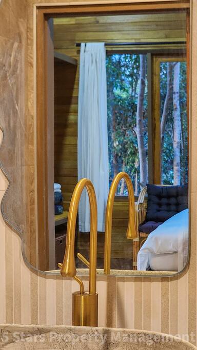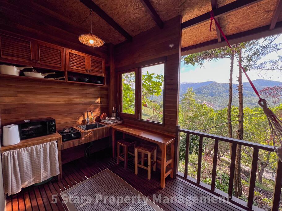 This cabin feels like sleeping in the treetops. Handcrafted from warm teak wood throughout, it blends rustic charm with modern comfort — think treehouse for adults. Bedroom King-size bed with quality linens, positioned to catch the morning light through floor-to-ceiling windows. A/C and fan for your preference. Barn-style sliding door adds character. Bathroom Modern finishes meet natural materials — hand-carved stone basin, brass fixtures, rain shower. The organic-shaped mirror reflects the jungle through the window. Workspace Dedicated desk area with mountain views — one of the best "offices" on the island. Natural light, inspiring scenery, comfortable seating. Balcony Your private outdoor living room. Hammock for lazy afternoons, bean bag seating, and unobstructed views of the forested mountains. Watch the mist roll through the valley at sunrise. Kitchen Full cooking setup with stovetop, refrigerator, and essentials. Dining area with views. The vibe Warm wood everywhere, soft natural light filtering through trees, the sound of birds and rustling leaves. Quiet. Restorative.