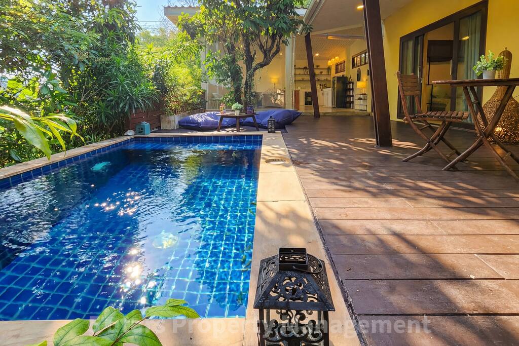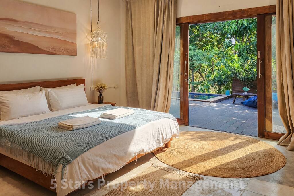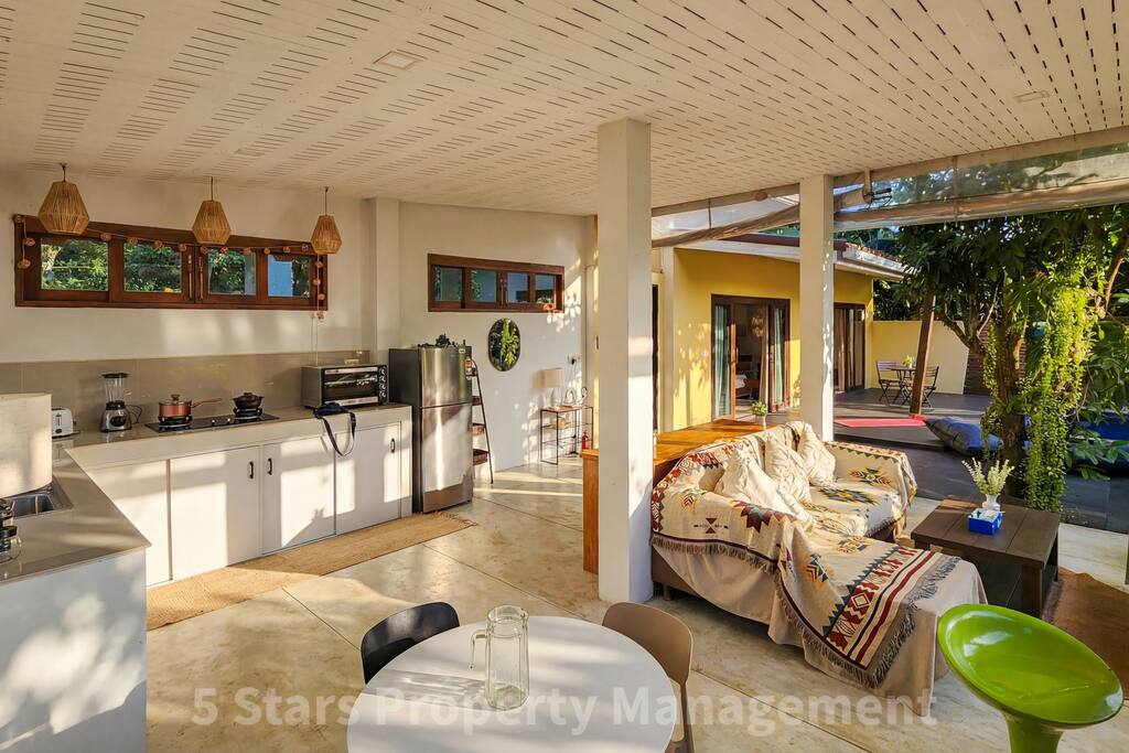 Wake up, slide open your door, and dive into your private pool surrounded by tropical greenery. This thoughtfully renovated villa offers the rare combination of designer comfort and genuine privacy in Koh Phangan's most laid-back village. Sleeping Bedroom 1 features a king bed plus additional sleeping, AC, and ensuite access. Bedroom 2 opens directly to the pool deck with its own workspace—ideal for morning work sessions with garden views. Living & Working Open-plan living flows into a fully equipped kitchen with sunset views through floor-to-ceiling windows. The dedicated workspace has an ergonomic chair and good natural light. Outdoors Your private pool and wooden deck are framed by one of the largest private gardens in the area—a genuine rarity here. 📸 Newly designed and decorated by professional interior designer 🛌 Soft orthopedic mattress & premium pillows 💎 Weekly cleaning by 5 Stars company 🎉 Concierge service: motorbike rental, yacht trips, diving, freediving, kite surfing, e-foil & more