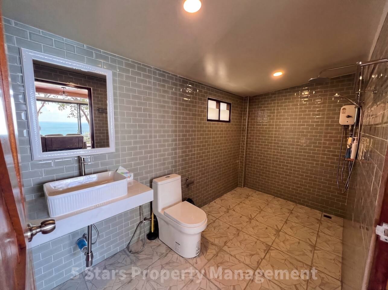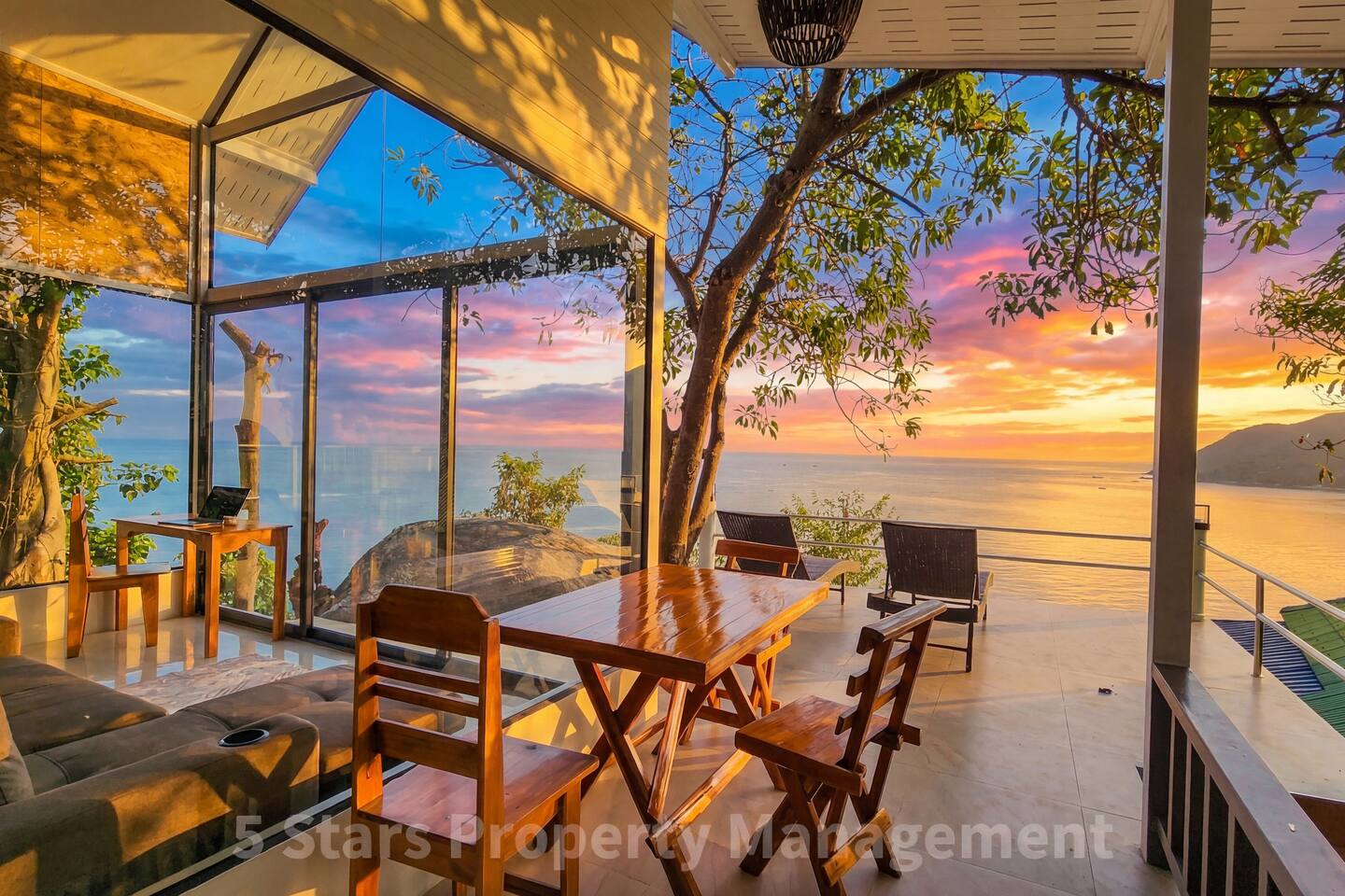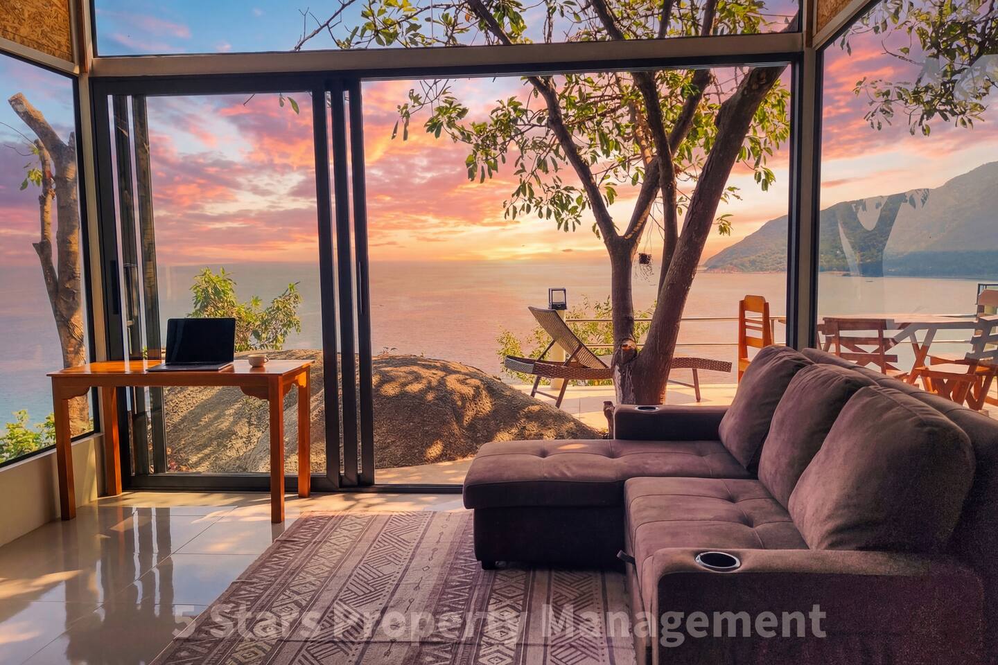 Ever woken up to meet a sunrise? Here, the sun greets you directly, filling our modern, rustic-style waterfront home with bright, natural light. The open-plan living space is designed to bring the outdoors in, featuring floor-to-ceiling glass walls that open onto a tiled patio. Key Features: Living Area: Relax on the large sectional sofa, watch a movie on the big flat-screen smart TV, or simply gaze out at the spectacular, expansive views of the turquoise ocean and green, hilly coastline. Sleeping Areas: Our home offers two comfortable sleeping areas: a serene main bedroom and a charming loft bedroom. Workspace: For those mixing work with pleasure, a dedicated workspace provides an inspiring spot to be productive. Kitchenette: The compact but well-equipped kitchenette features concrete-style counters, perfect for preparing light meals. Bathroom: The spacious bathroom includes modern grey subway tiles.