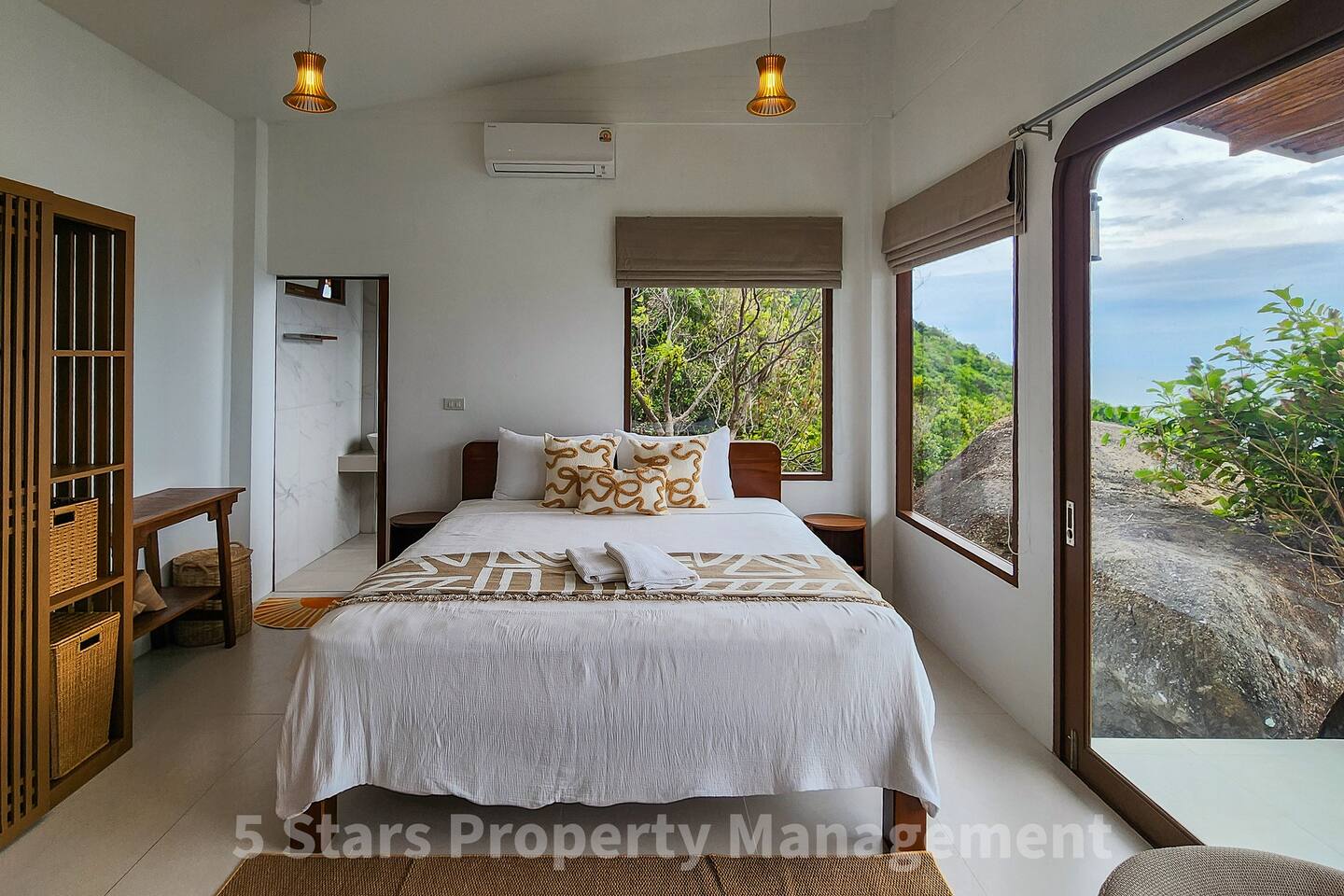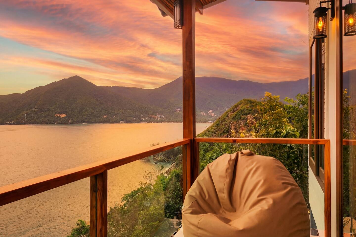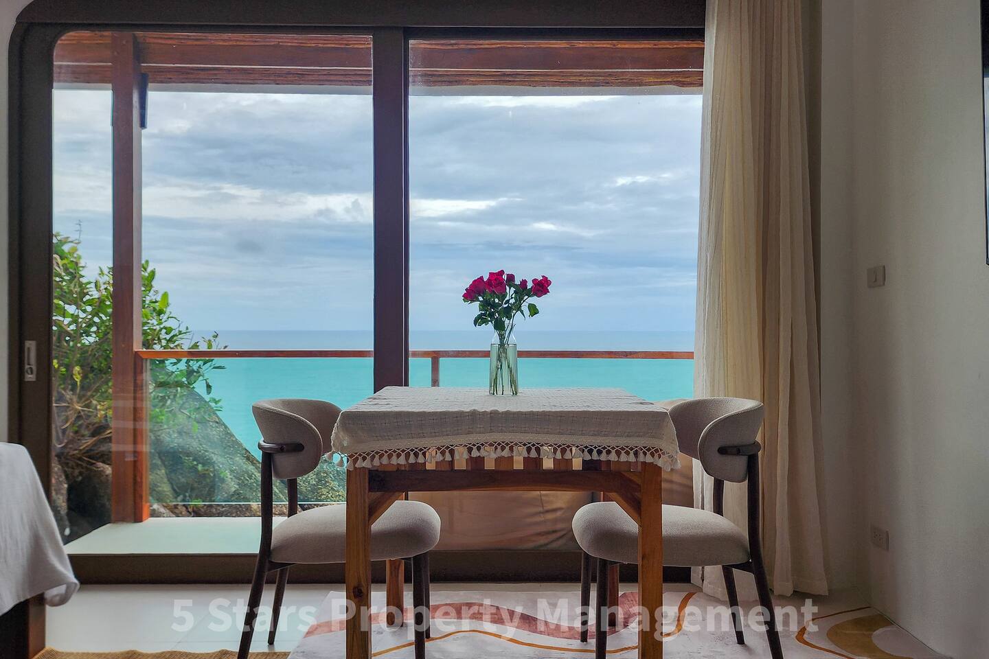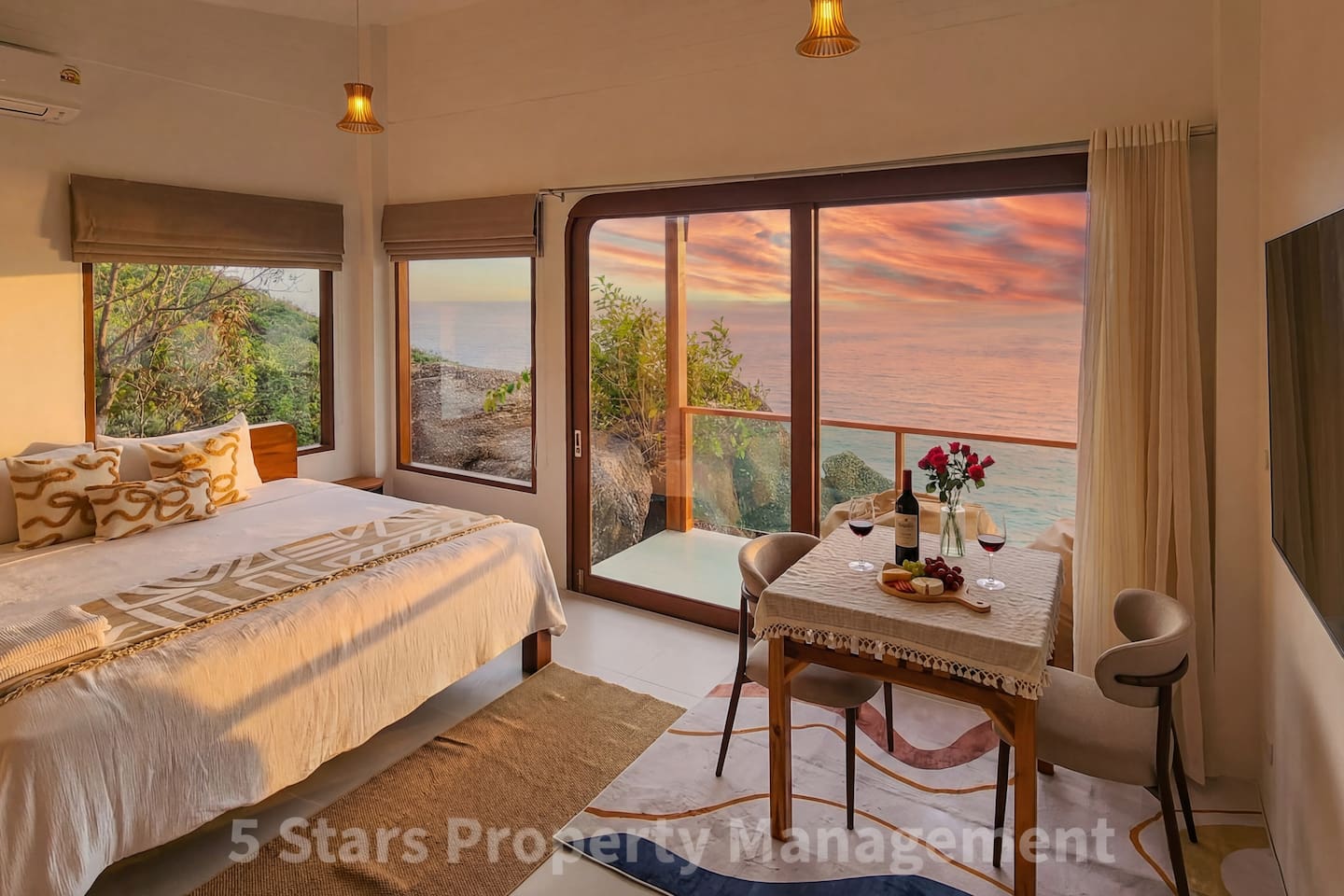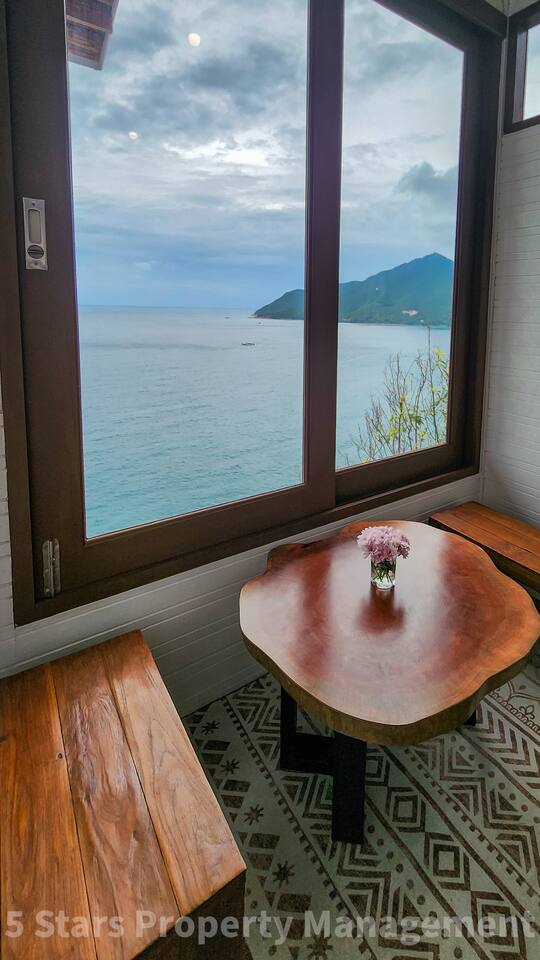 Designed to blend seamlessly with the jungle and sea, this villa features floor-to-ceiling glass walls and natural wood textures, creating an immersive "floating" experience. Your private balcony is the heart of the home. Relax on the oversized bean bags or enjoy a romantic dinner while watching the fishing boats in the bay below. The deck features glass railings to ensure your view of the turquoise water is never blocked. Living & Sleeping Bedroom: King-sized comfort with direct ocean views. High-quality linens and blackout options ensure deep rest. Equipped with powerful Air Conditioning for those warm tropical nights, even though with fresh sea breeze its rarely used. Bathroom: A spa-like experience featuring a rain shower and a massive picture window, allowing you to shower with a view of the ocean and nature. Design: Modern minimalist decor with custom wooden furniture and live-edge tables.