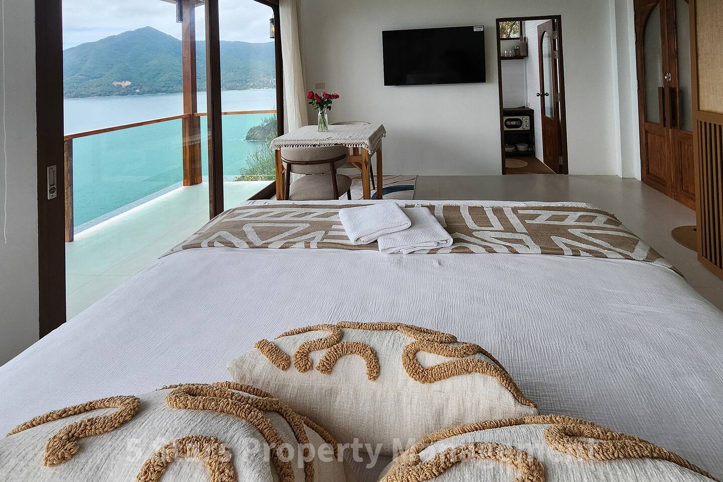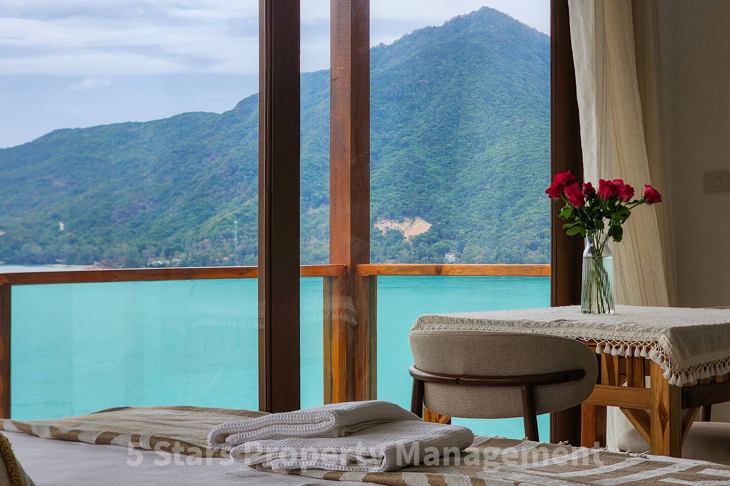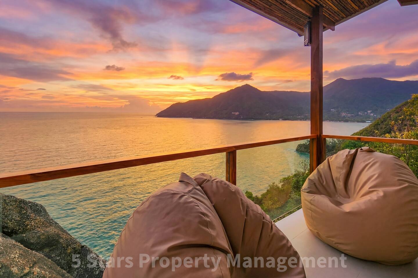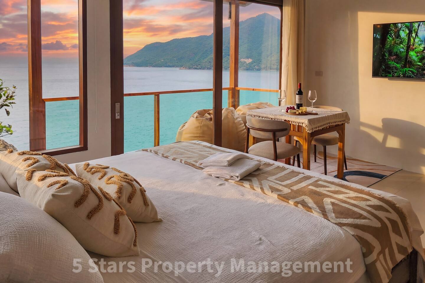 Designed to blend seamlessly with the jungle and sea, this villa features floor-to-ceiling glass walls and natural wood textures, creating an immersive "floating" experience. Your private balcony is the heart of the home. Relax on the oversized bean bags or enjoy a romantic dinner while watching the fishing boats in the bay below. The deck features glass railings to ensure your view of the turquoise water is never blocked. Living & Sleeping Bedroom: King-sized comfort with direct ocean views. High-quality linens and blackout options ensure deep rest. Equipped with powerful Air Conditioning for those warm tropical nights, even though with fresh sea breeze its rarely used. Bathroom: A spa-like experience featuring a rain shower and a massive picture window, allowing you to shower with a view of the ocean and nature. Design: Modern minimalist decor with custom wooden furniture and live-edge tables.