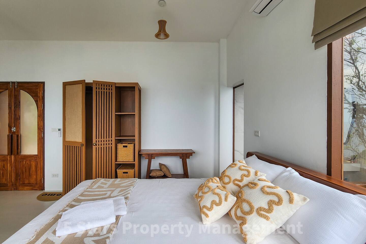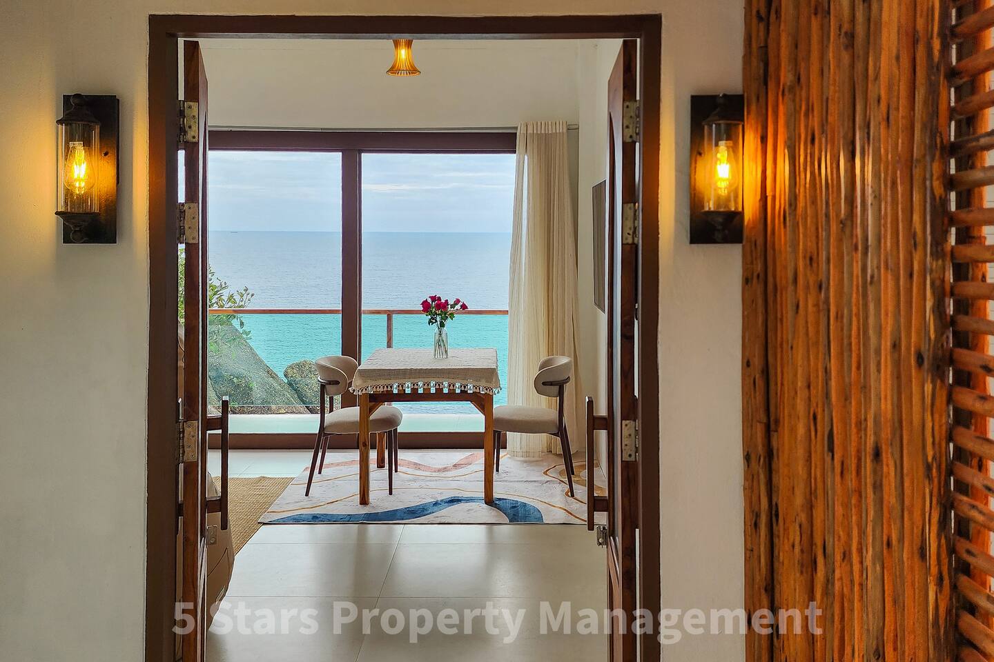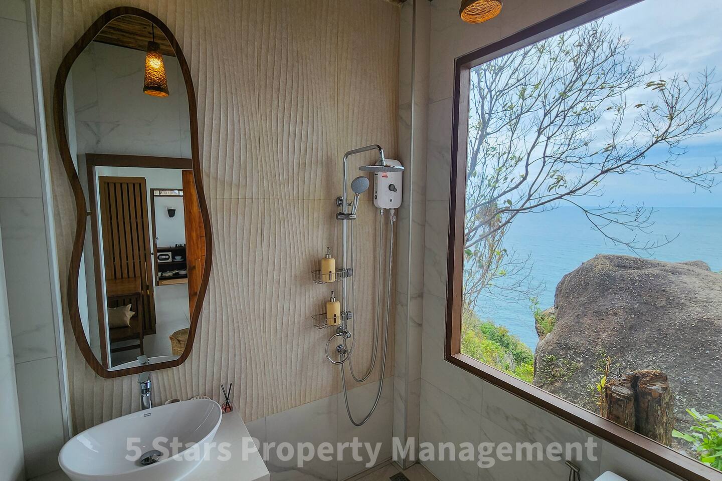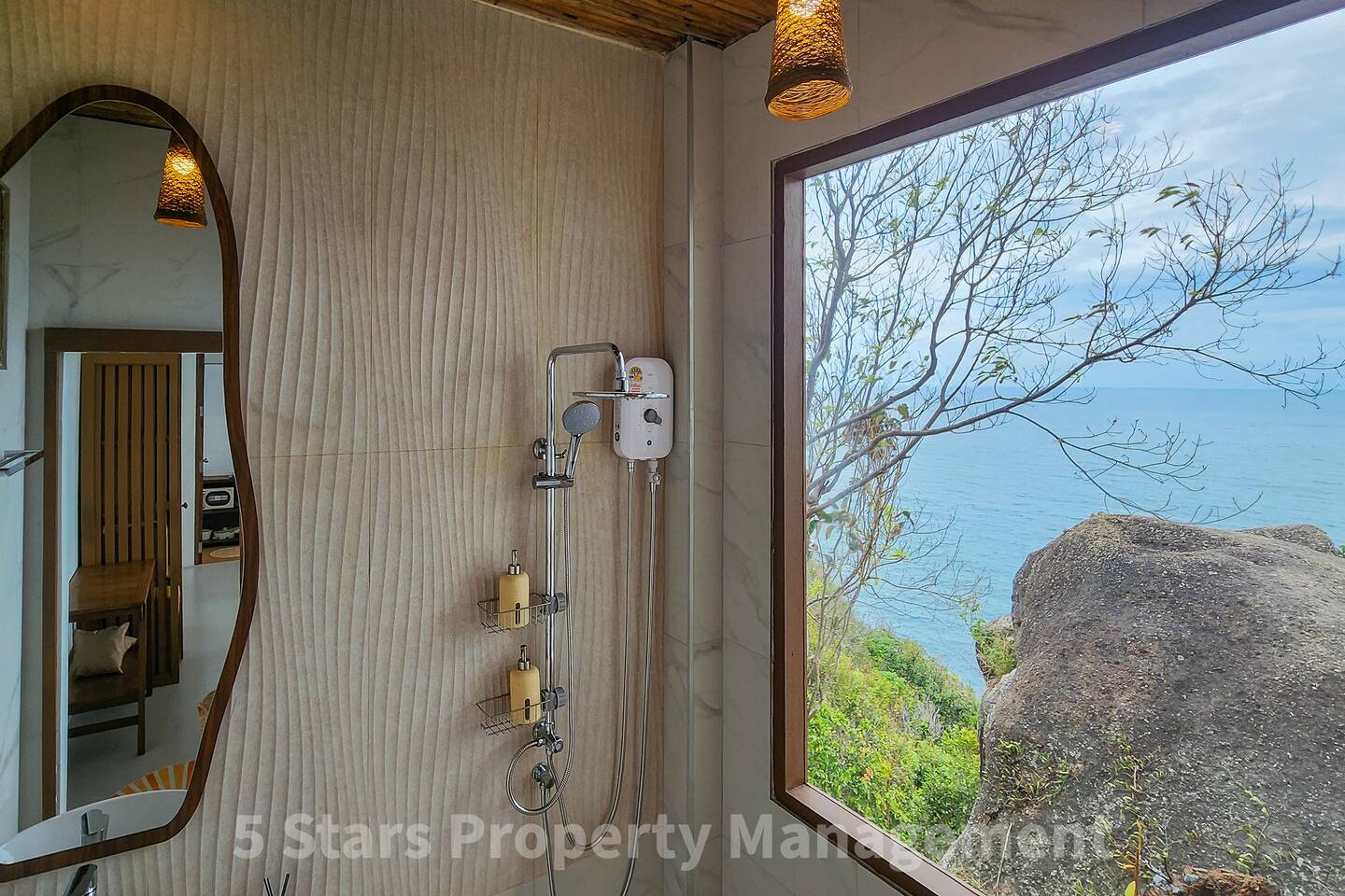 Designed to blend seamlessly with the jungle and sea, this villa features floor-to-ceiling glass walls and natural wood textures, creating an immersive "floating" experience. Your private balcony is the heart of the home. Relax on the oversized bean bags or enjoy a romantic dinner while watching the fishing boats in the bay below. The deck features glass railings to ensure your view of the turquoise water is never blocked. Living & Sleeping Bedroom: King-sized comfort with direct ocean views. High-quality linens and blackout options ensure deep rest. Equipped with powerful Air Conditioning for those warm tropical nights, even though with fresh sea breeze its rarely used. Bathroom: A spa-like experience featuring a rain shower and a massive picture window, allowing you to shower with a view of the ocean and nature. Design: Modern minimalist decor with custom wooden furniture and live-edge tables.