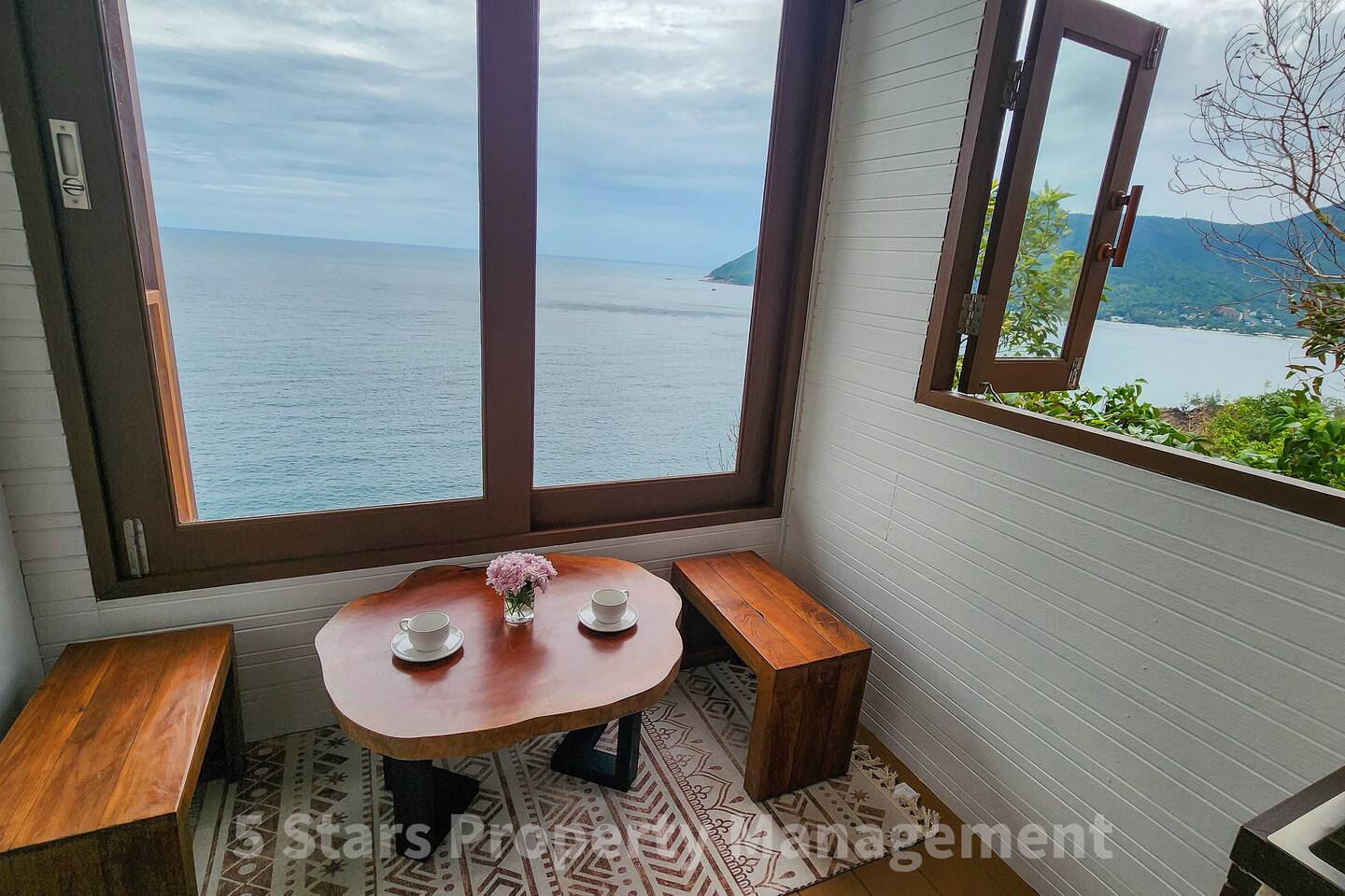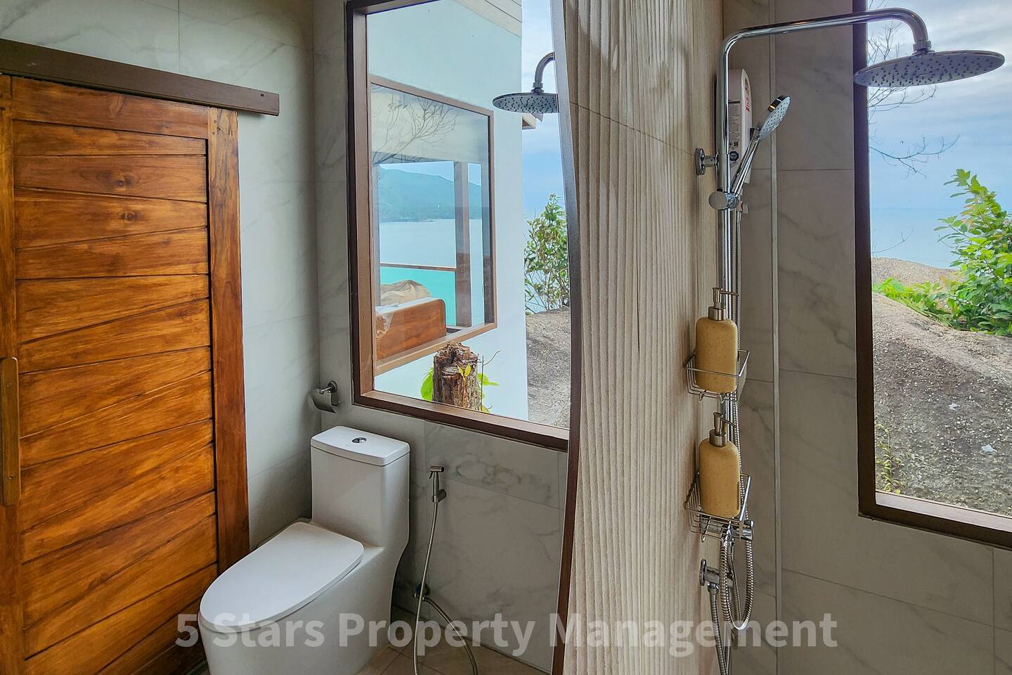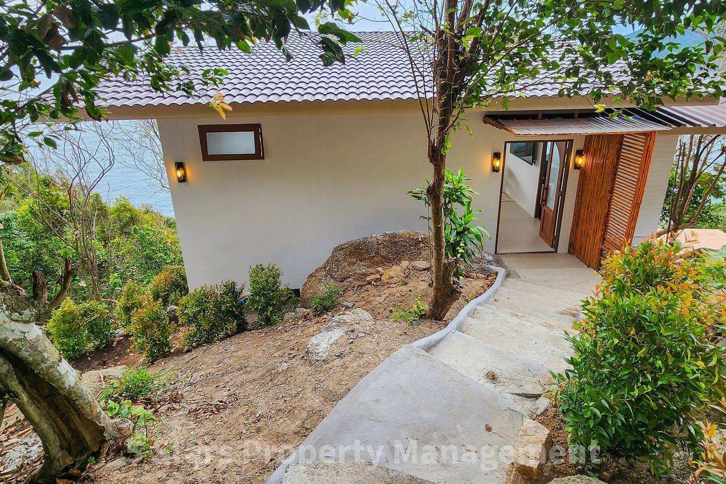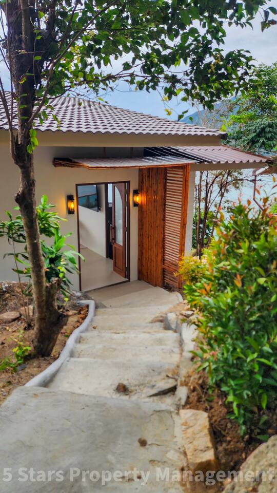 You have exclusive, private access to the entire villa and the surrounding deck. The property is located on a hillside to maximize the view, which requires walking up a set of stairs/pathway. Parking for motorbikes is available near the entrance.