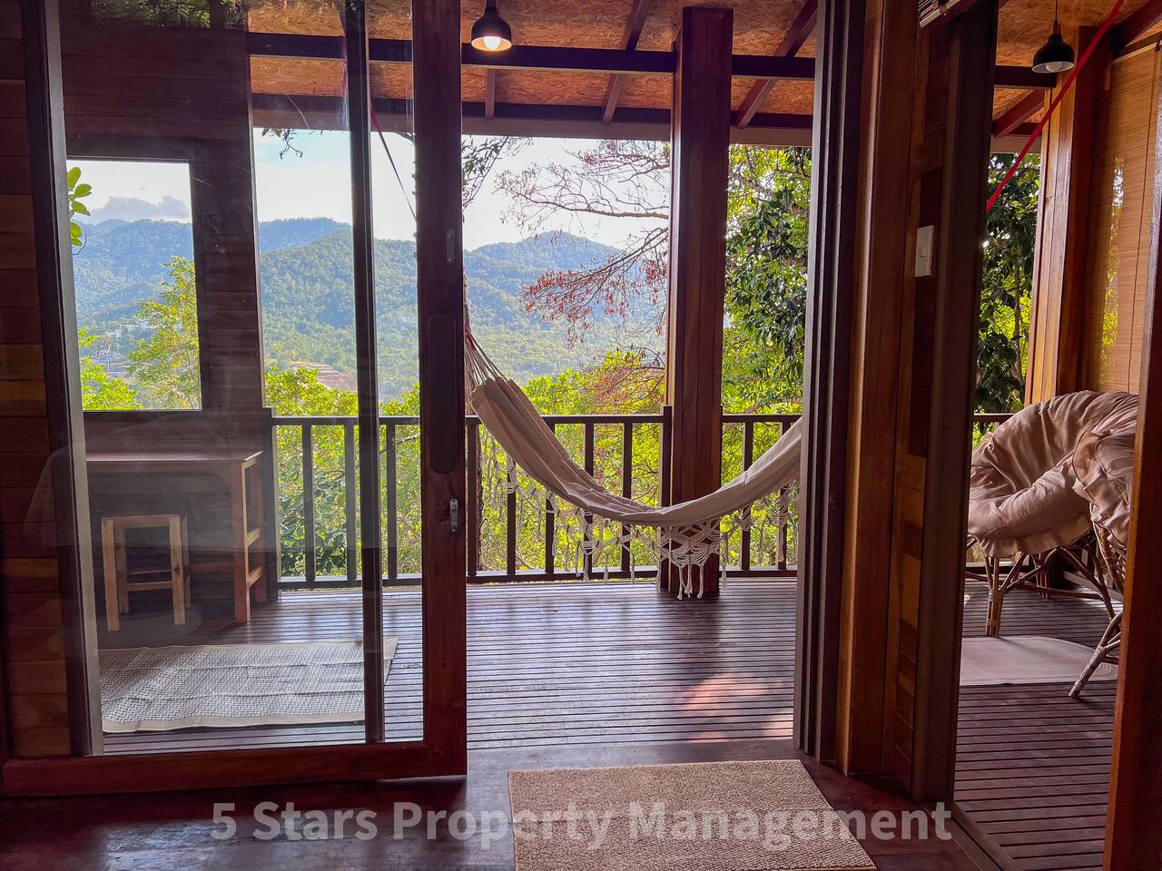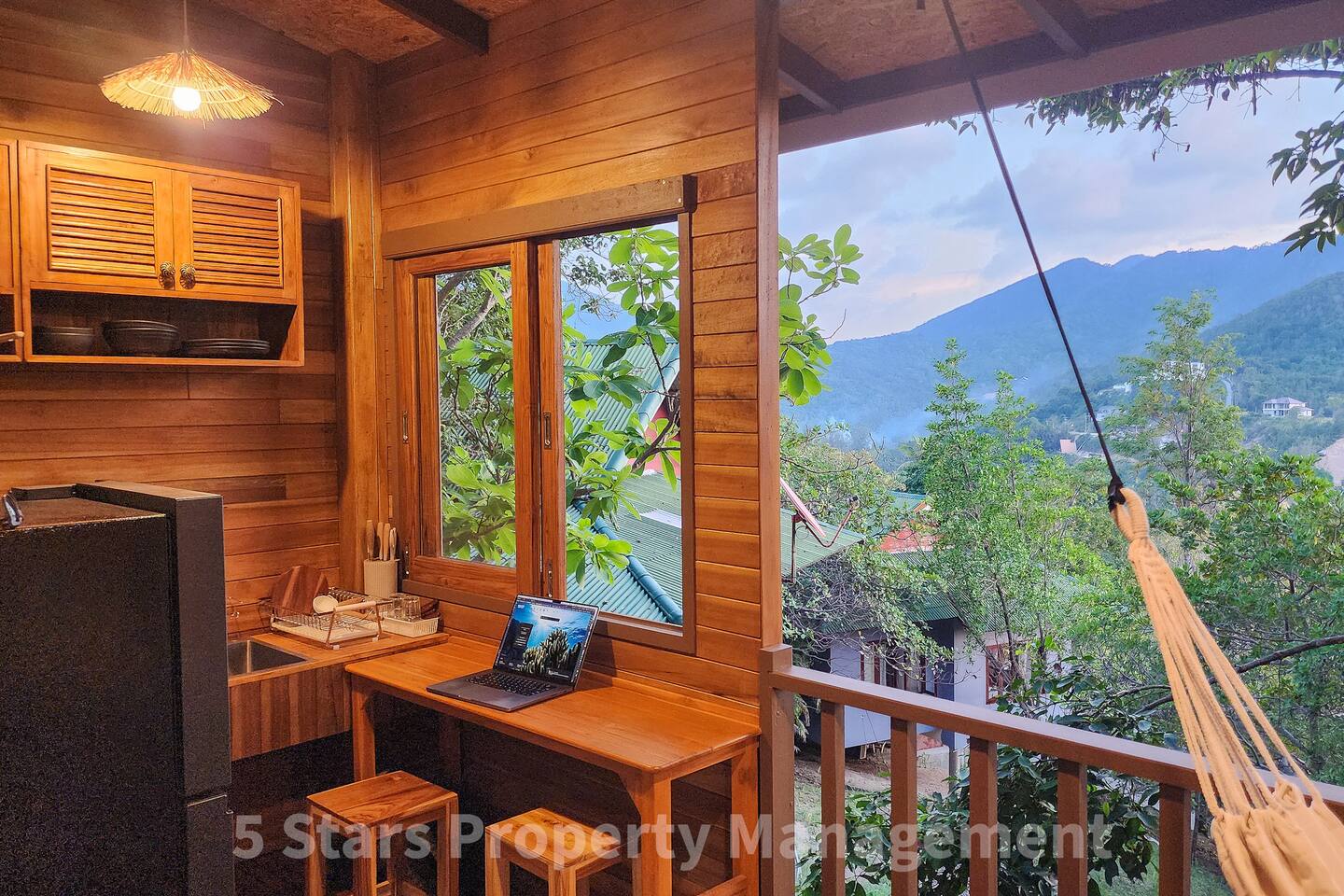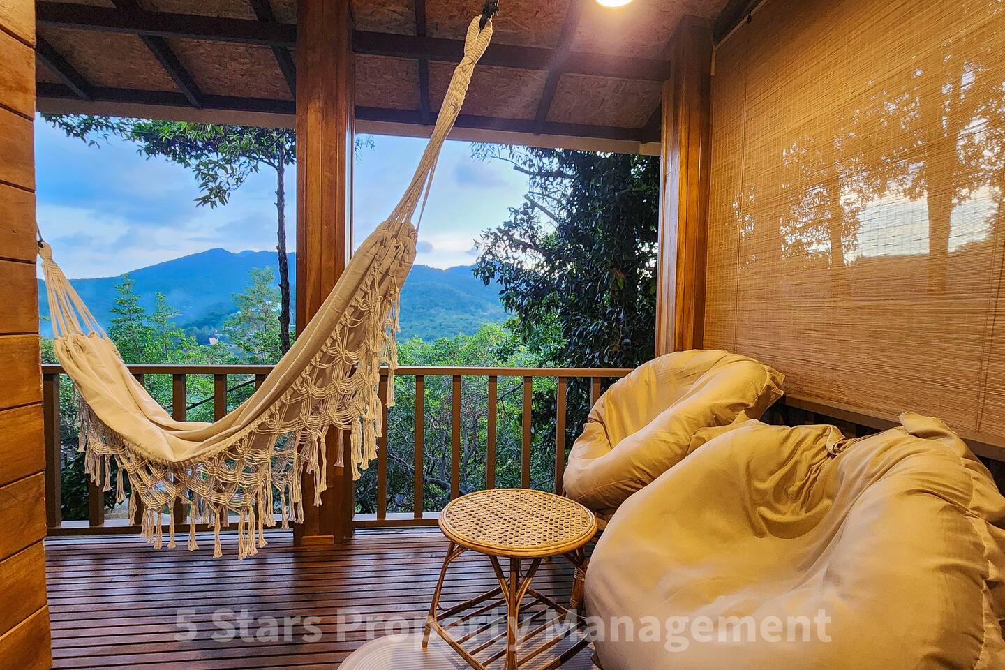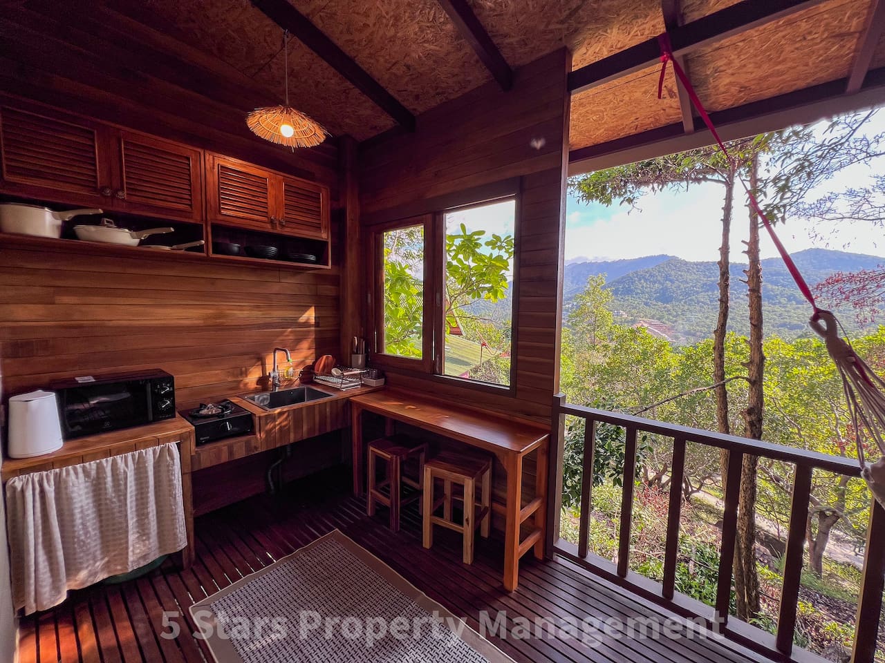 This cabin feels like sleeping in the treetops. Handcrafted from warm teak wood throughout, it blends rustic charm with modern comfort — think treehouse for adults. Bedroom King-size bed with quality linens, positioned to catch the morning light through floor-to-ceiling windows. A/C and fan for your preference. Barn-style sliding door adds character. Bathroom Modern finishes meet natural materials — hand-carved stone basin, brass fixtures, rain shower. The organic-shaped mirror reflects the jungle through the window. Workspace Dedicated desk area with mountain views — one of the best "offices" on the island. Natural light, inspiring scenery, comfortable seating. Balcony Your private outdoor living room. Hammock for lazy afternoons, bean bag seating, and unobstructed views of the forested mountains. Watch the mist roll through the valley at sunrise. Kitchen Full cooking setup with stovetop, refrigerator, and essentials. Dining area with views. The vibe Warm wood everywhere, soft natural light filtering through trees, the sound of birds and rustling leaves. Quiet. Restorative.