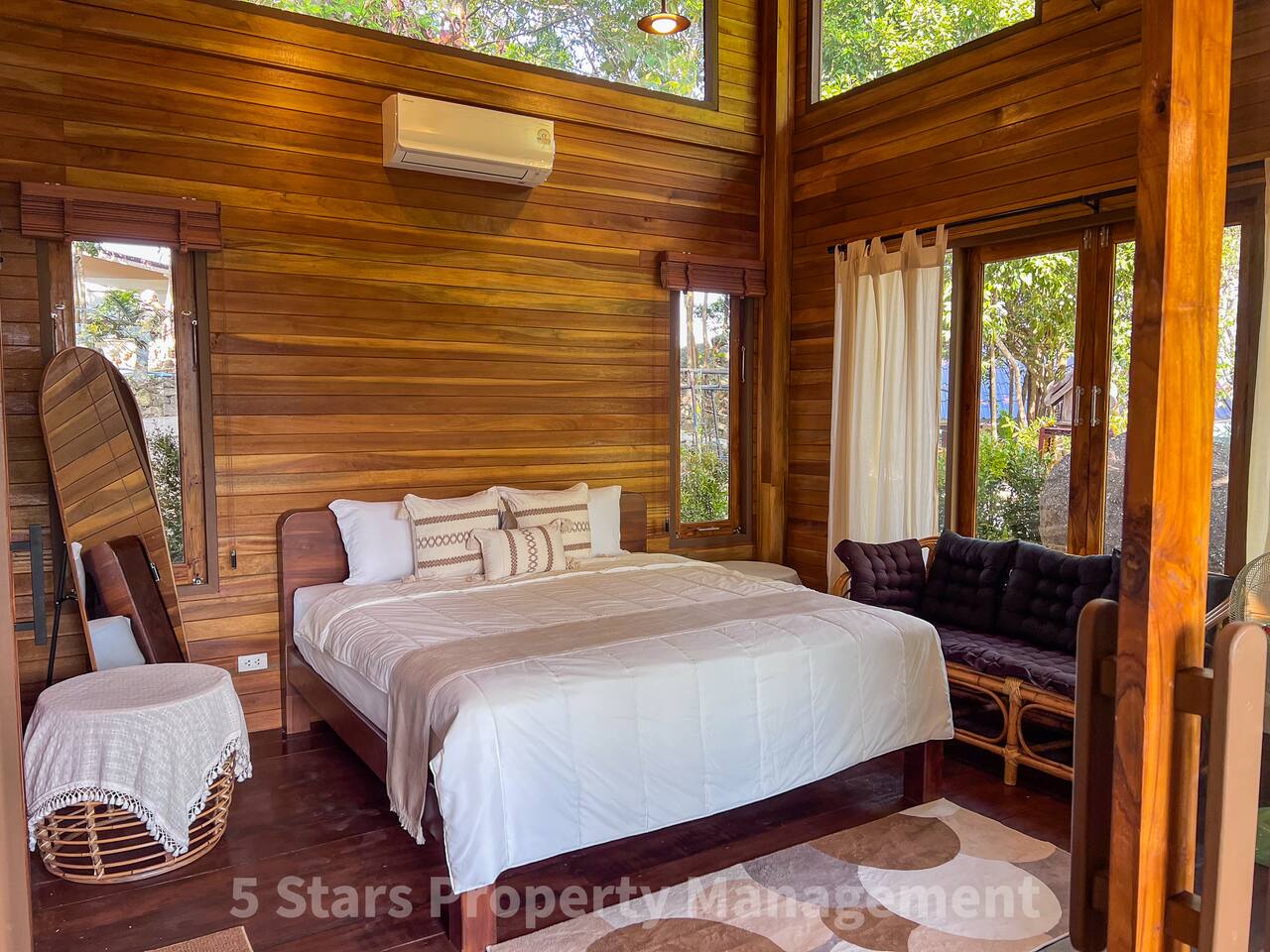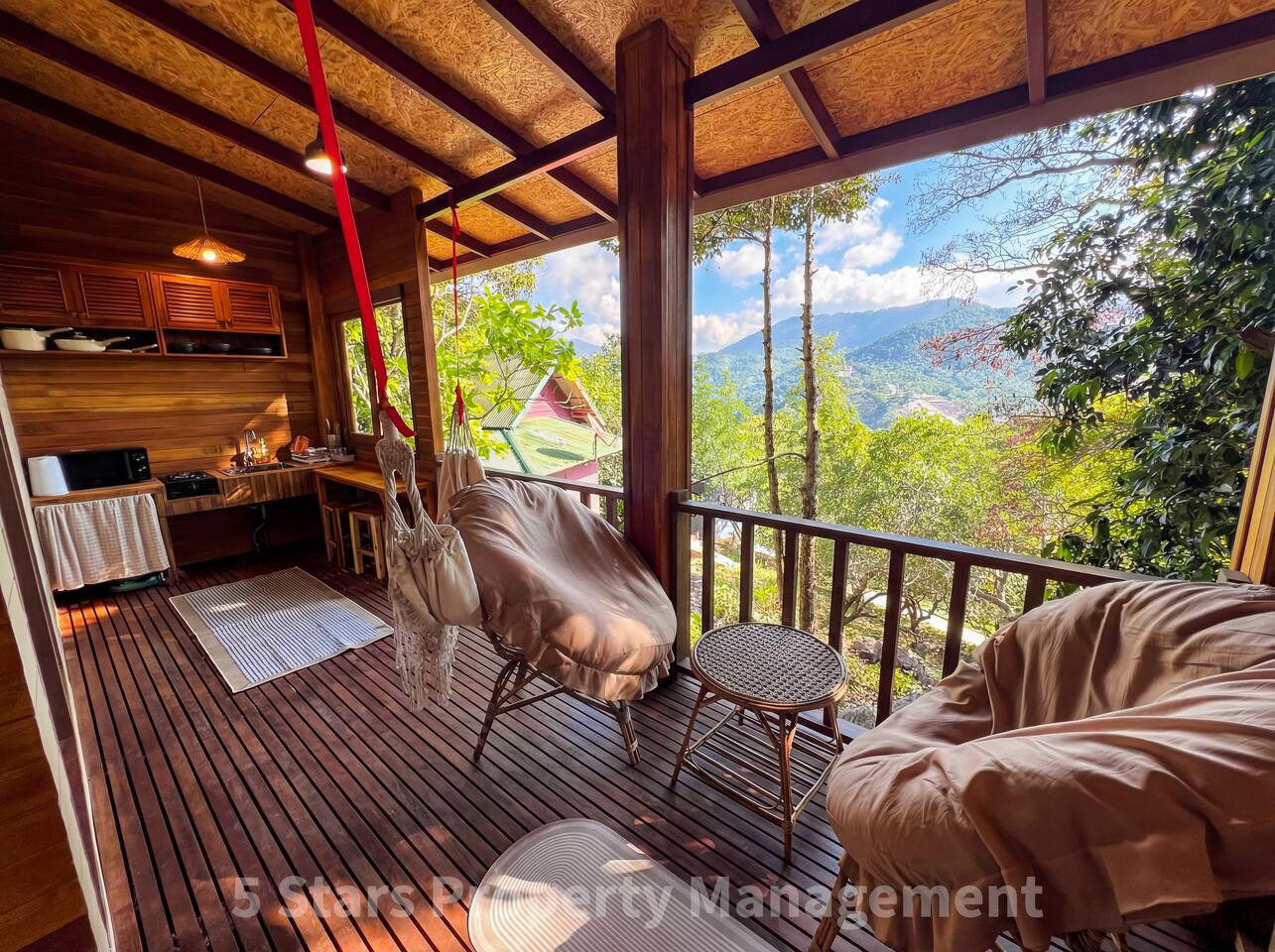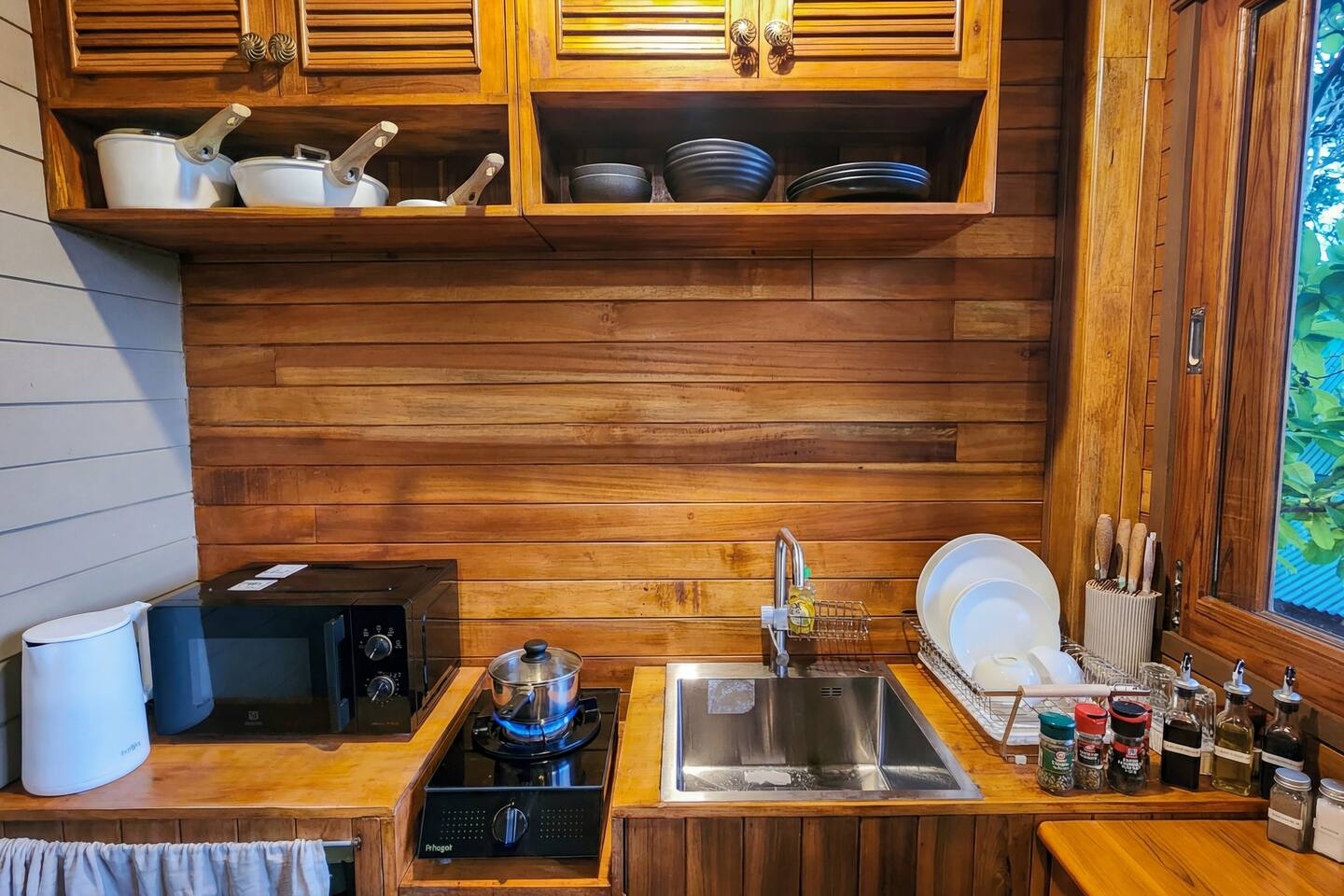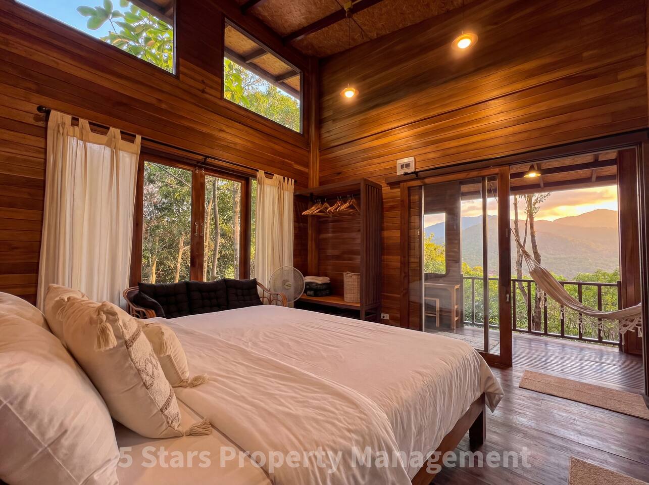 This cabin feels like sleeping in the treetops. Handcrafted from warm teak wood throughout, it blends rustic charm with modern comfort — think treehouse for adults. Bedroom King-size bed with quality linens, positioned to catch the morning light through floor-to-ceiling windows. A/C and fan for your preference. Barn-style sliding door adds character. Bathroom Modern finishes meet natural materials — hand-carved stone basin, brass fixtures, rain shower. The organic-shaped mirror reflects the jungle through the window. Workspace Dedicated desk area with mountain views — one of the best "offices" on the island. Natural light, inspiring scenery, comfortable seating. Balcony Your private outdoor living room. Hammock for lazy afternoons, bean bag seating, and unobstructed views of the forested mountains. Watch the mist roll through the valley at sunrise. Kitchen Full cooking setup with stovetop, refrigerator, and essentials. Dining area with views. The vibe Warm wood everywhere, soft natural light filtering through trees, the sound of birds and rustling leaves. Quiet. Restorative.