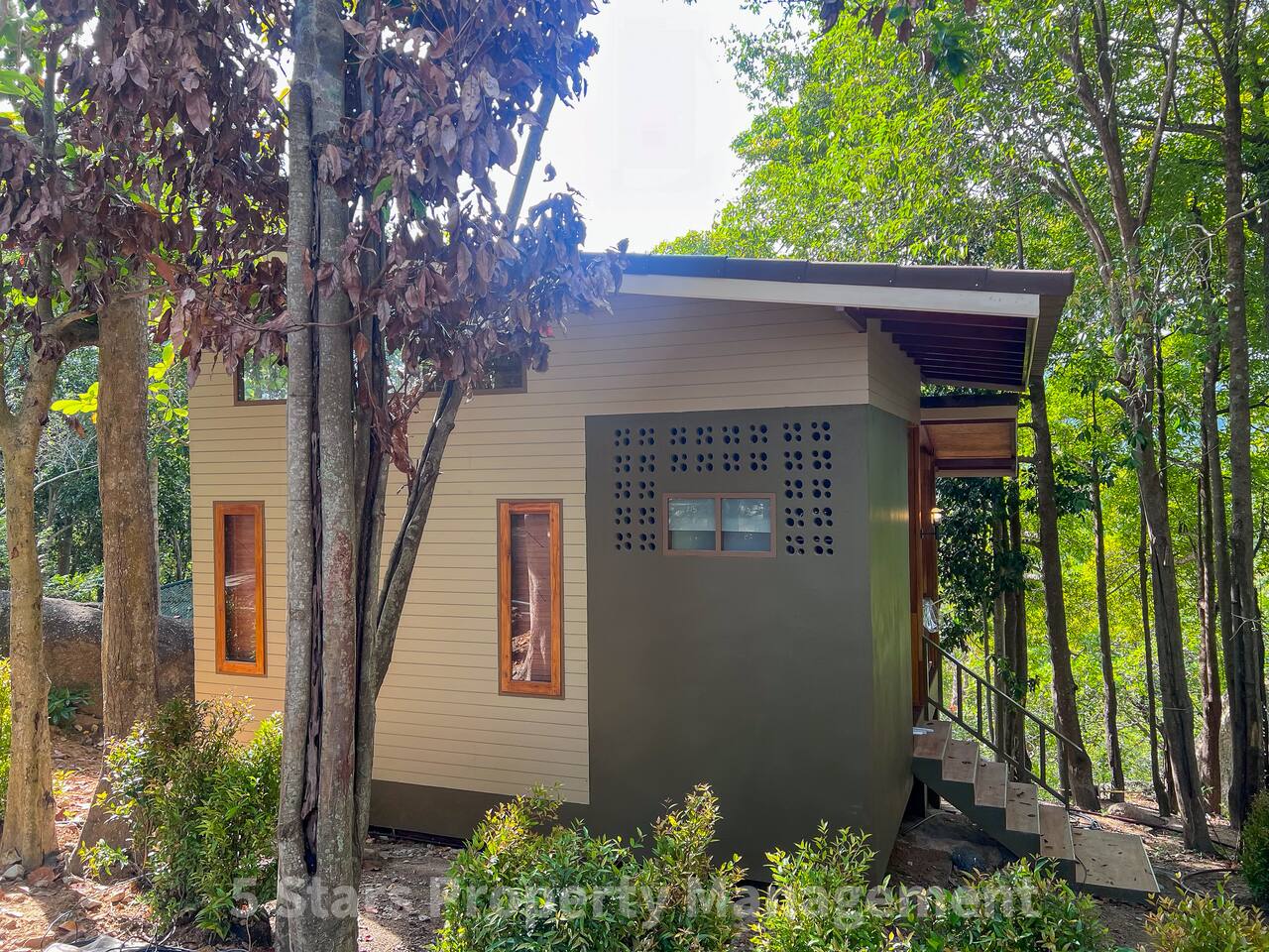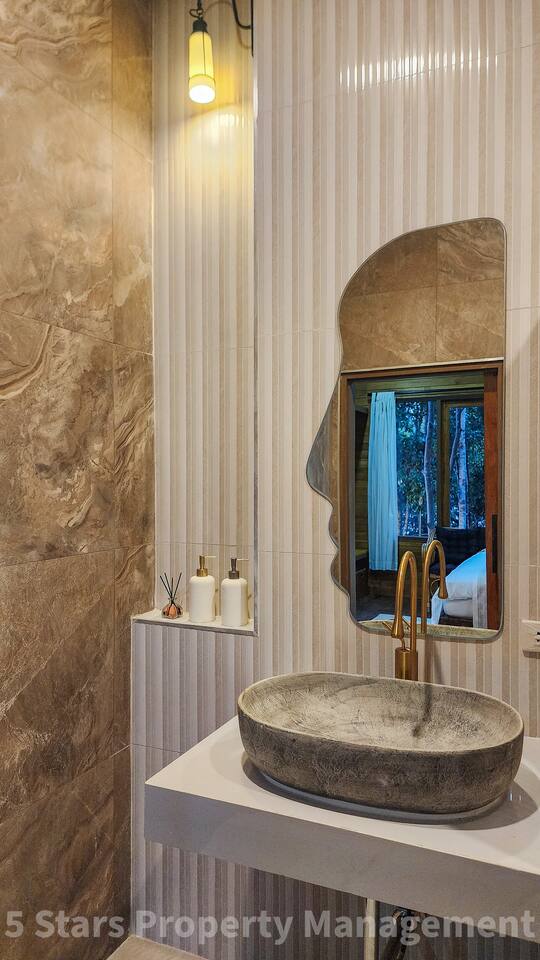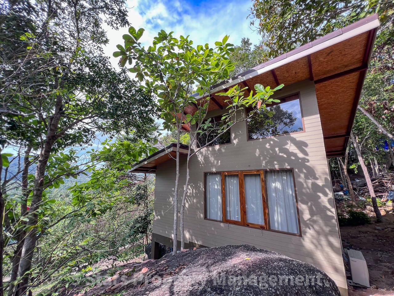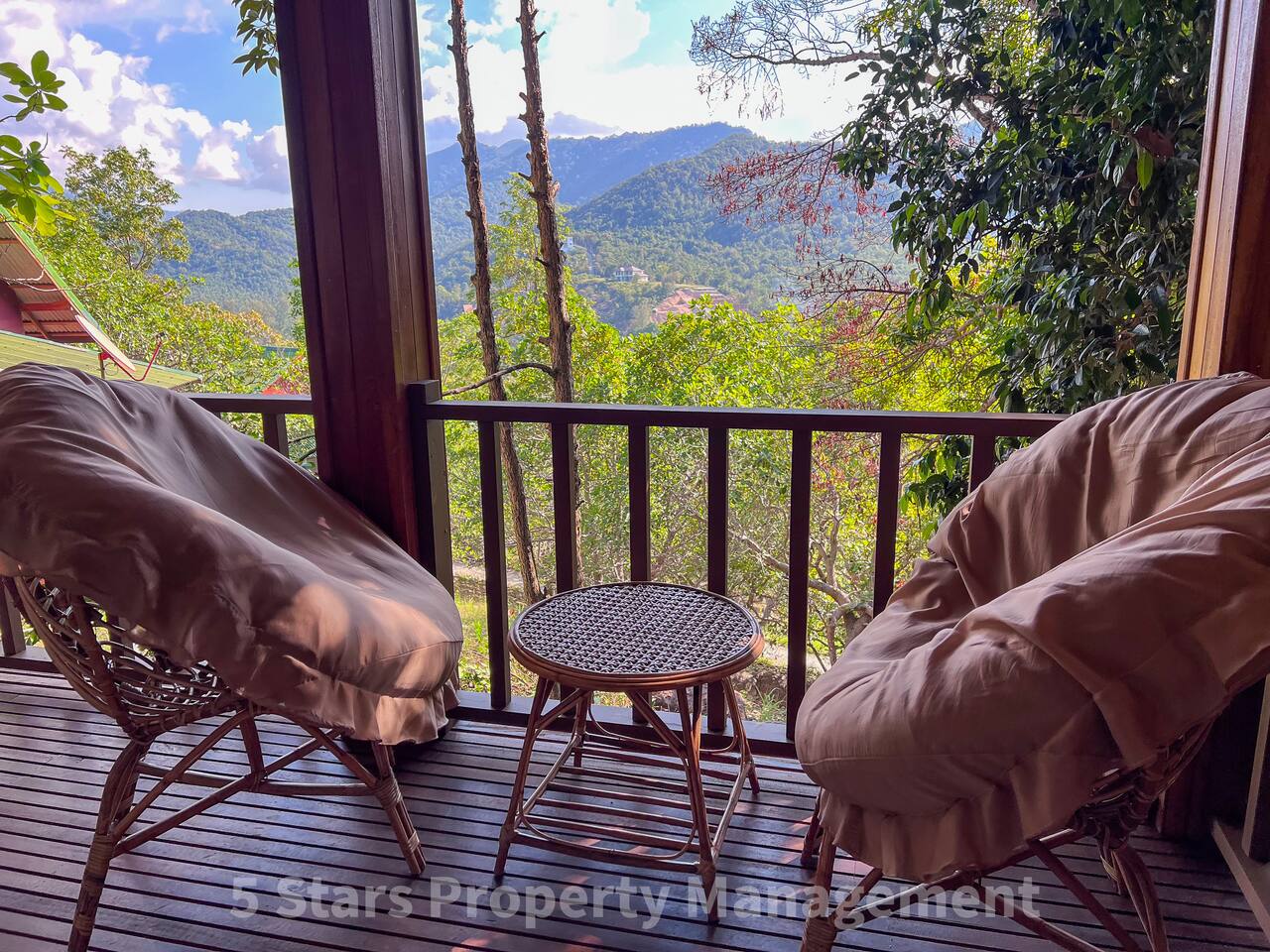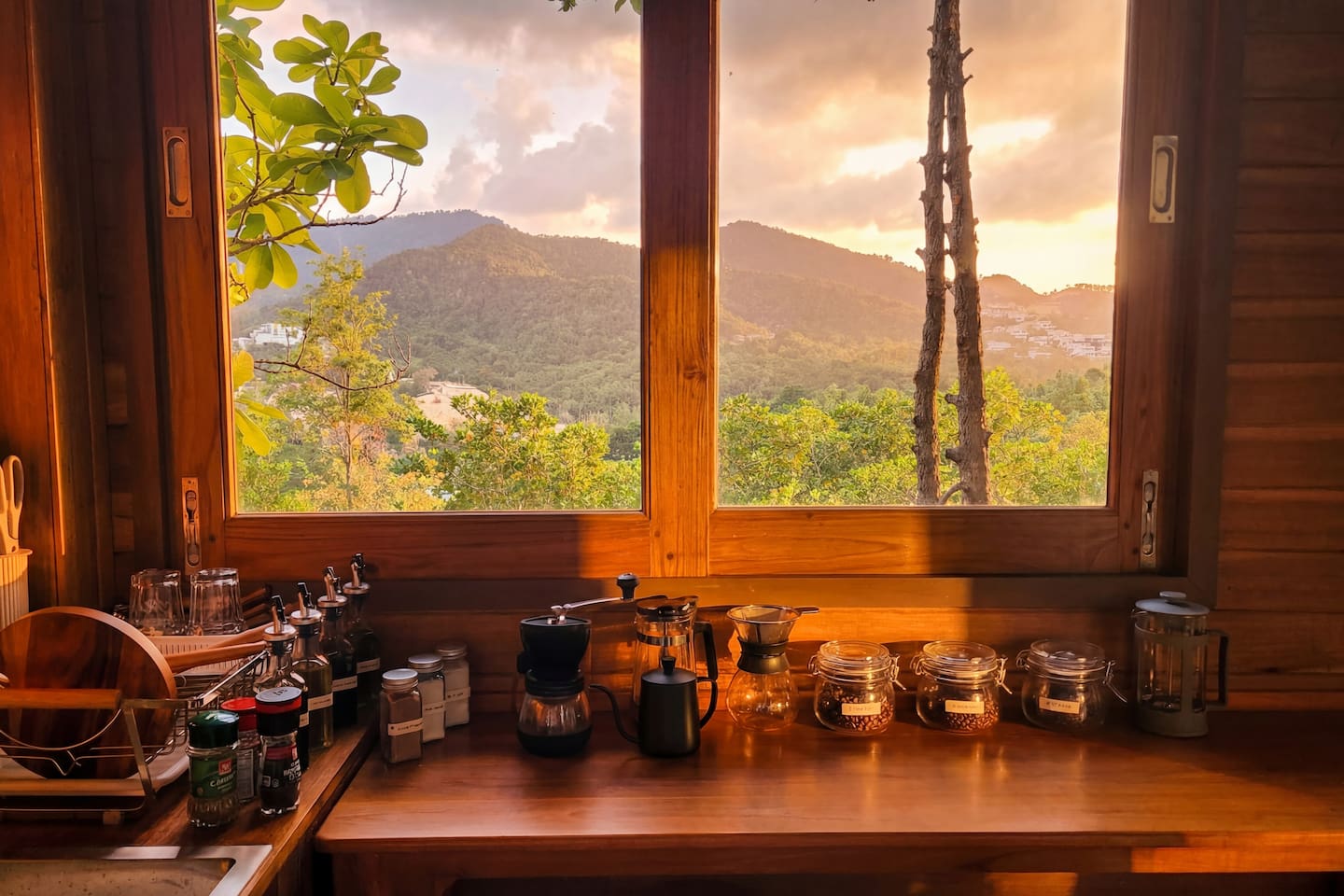This cabin feels like sleeping in the treetops. Handcrafted from warm teak wood throughout, it blends rustic charm with modern comfort — think treehouse for adults. Bedroom King-size bed with quality linens, positioned to catch the morning light through floor-to-ceiling windows. A/C and fan for your preference. Barn-style sliding door adds character. Bathroom Modern finishes meet natural materials — hand-carved stone basin, brass fixtures, rain shower. The organic-shaped mirror reflects the jungle through the window. Workspace Dedicated desk area with mountain views — one of the best "offices" on the island. Natural light, inspiring scenery, comfortable seating. Balcony Your private outdoor living room. Hammock for lazy afternoons, bean bag seating, and unobstructed views of the forested mountains. Watch the mist roll through the valley at sunrise. Kitchen Full cooking setup with stovetop, refrigerator, and essentials. Dining area with views. The vibe Warm wood everywhere, soft natural light filtering through trees, the sound of birds and rustling leaves. Quiet. Restorative.