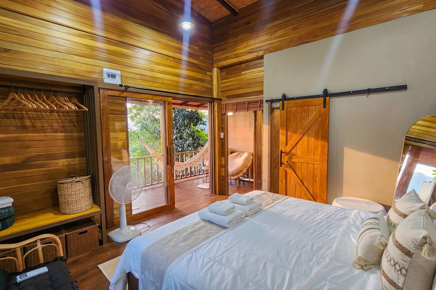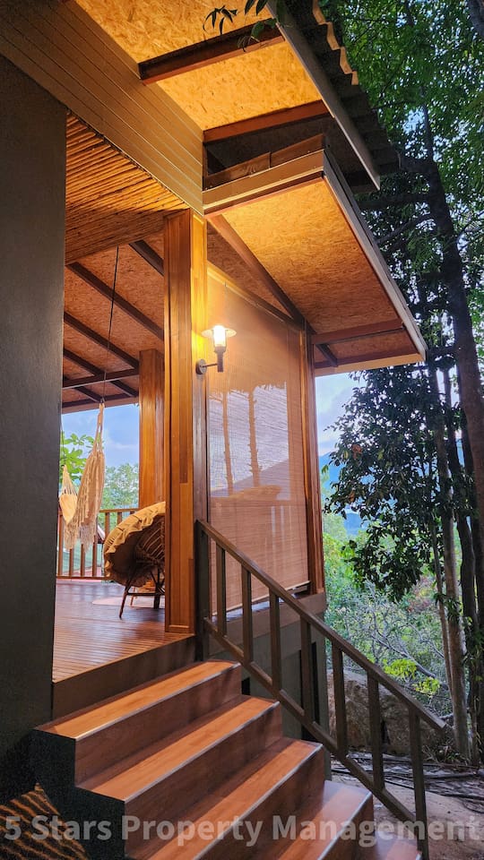Escape to this handcrafted wooden cabin nestled in the jungle canopy with panoramic mountain views. Perfect for couples or remote workers craving nature immersion without sacrificing comfort. Swing in your private hammock watching sunrise over the hills, or work from the dedicated desk surrounded by treetops. Warm teak interiors, full kitchen, modern bathroom with artisan stone sink. Peaceful location away from the crowds yet 10 mins to beaches. Self check-in, A/C, fast WiFi.