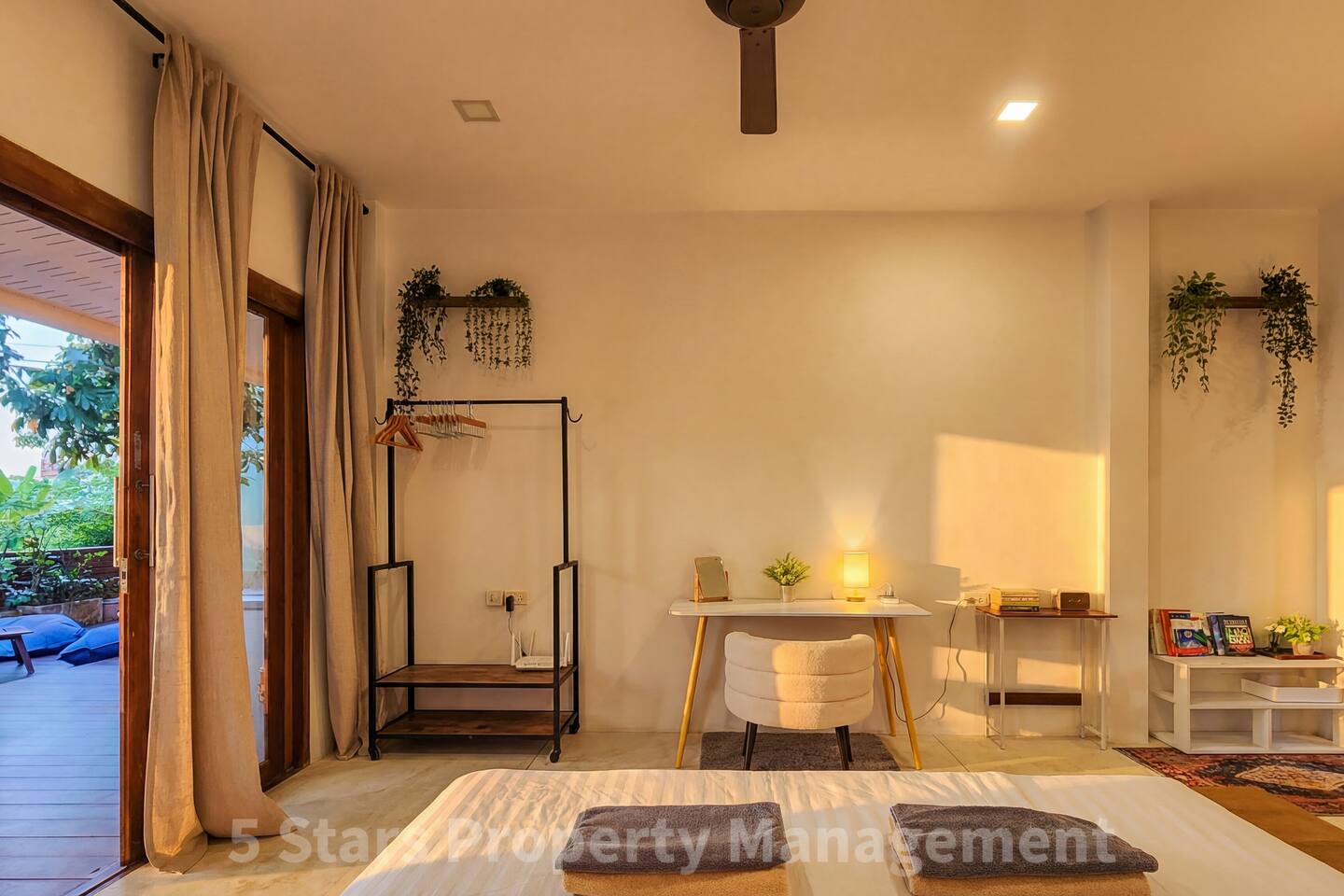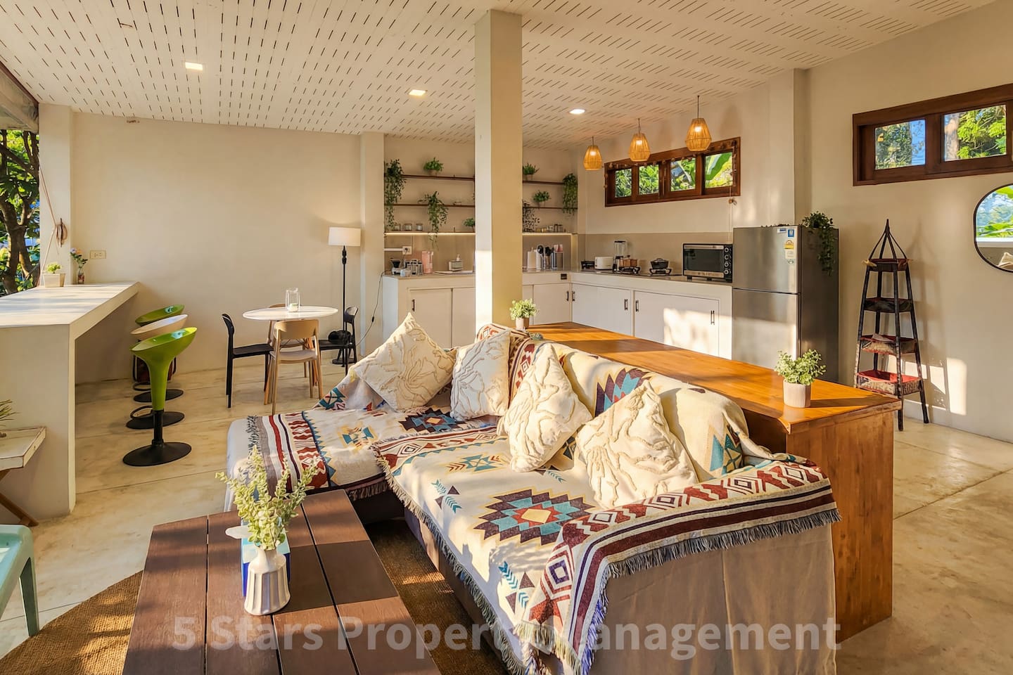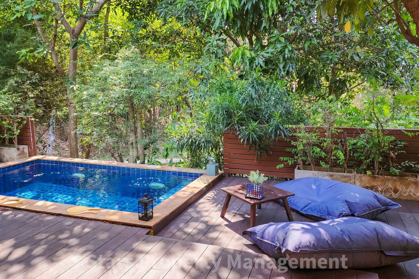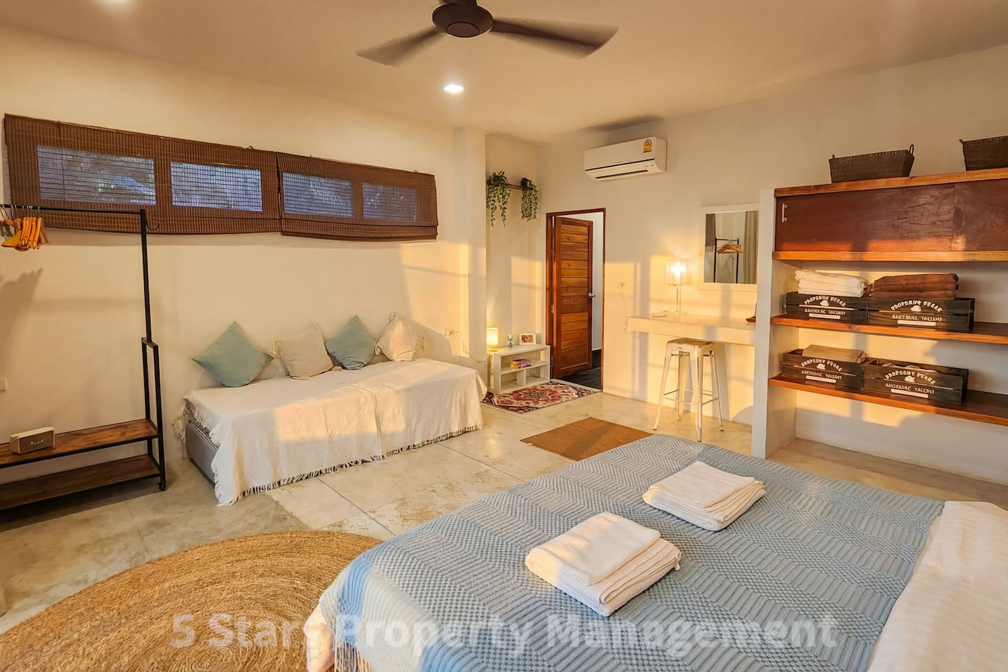 Wake up, slide open your door, and dive into your private pool surrounded by tropical greenery. This thoughtfully renovated villa offers the rare combination of designer comfort and genuine privacy in Koh Phangan's most laid-back village. Sleeping Bedroom 1 features a king bed plus additional sleeping, AC, and ensuite access. Bedroom 2 opens directly to the pool deck with its own workspace—ideal for morning work sessions with garden views. Living & Working Open-plan living flows into a fully equipped kitchen with sunset views through floor-to-ceiling windows. The dedicated workspace has an ergonomic chair and good natural light. Outdoors Your private pool and wooden deck are framed by one of the largest private gardens in the area—a genuine rarity here. 📸 Newly designed and decorated by professional interior designer 🛌 Soft orthopedic mattress & premium pillows 💎 Weekly cleaning by 5 Stars company 🎉 Concierge service: motorbike rental, yacht trips, diving, freediving, kite surfing, e-foil & more